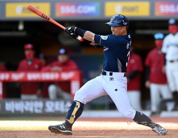 15일 인천 SSG 랜더스필드에서 ‘2022 신한은행 SOL KBO리그’ SSG 랜더스와 NC 다이노스의 경기가 열렸다. 9회초 무사 1, 2루에서 NC 손아섭이 동점 적시타를 날리고 있다.