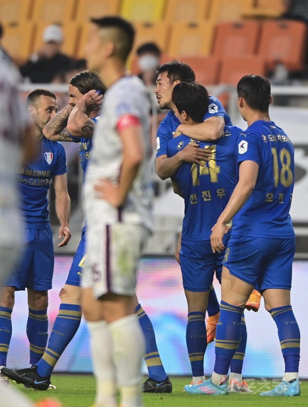17일 경기도 수원월드컵경기장에서 열린 ‘하나원큐 K리그1 2022’ 수원 삼성과 김천 상무의 경기에서 수원 이기제가 선제골을 성공시킨 후 동료들과 기쁨을 나누고 있다.