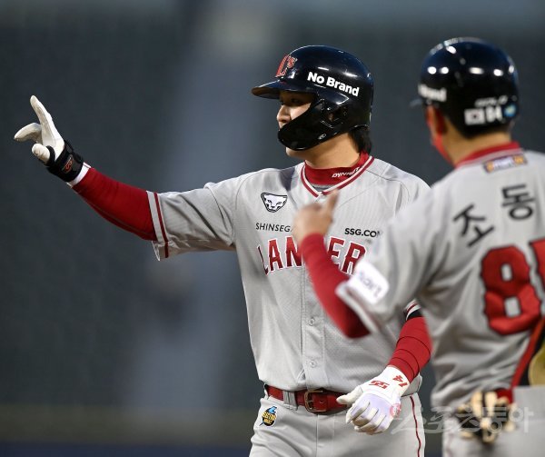 17일 서울 잠실야구장에서 ‘2022 신한은행 MY CAR KBO리그’ SSG 랜더스와 두산 베어스 경기가 열렸다. 3회초 2사 SSG 최정이 중전 안타를 치고 1루에서 기뻐하고 있다.