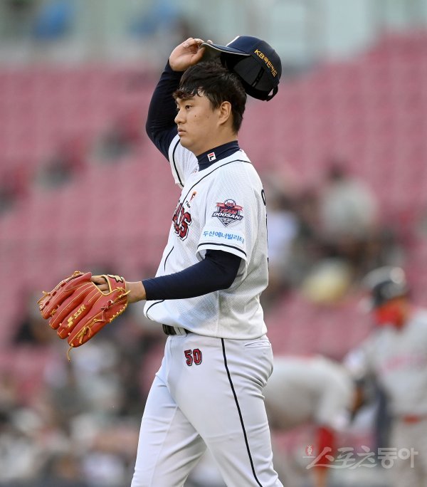 17일 서울 잠실야구장에서 ‘2022 신한은행 MY CAR KBO리그’ SSG 랜더스와 두산 베어스 경기가 열렸다. 두산 선발 이영하가 1회초 1사 1,3루 상황에서 안타를 허용하며 실점한 후 외야를 바라보고 있다.