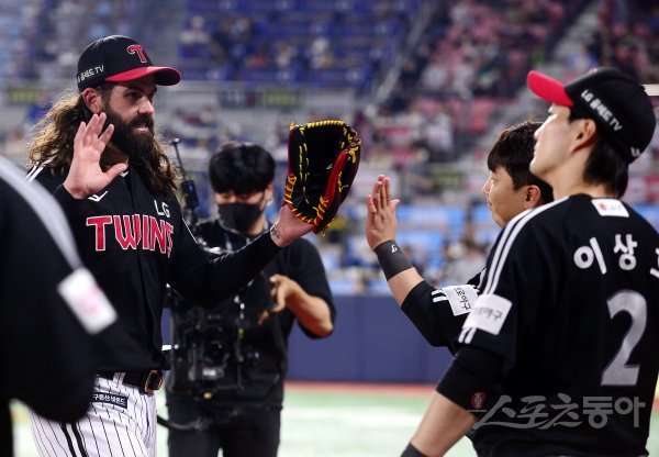 17일 경기도 수원kt위즈파크에서 ‘2022 신한은행 SOL KBO리그’ kt 위즈와 LG 트윈스의 경기가 열렸다. LG 선발 켈리가 5회까지 kt 공격을 무실점으로 막은 후 더그아웃으로 향하고 있다.