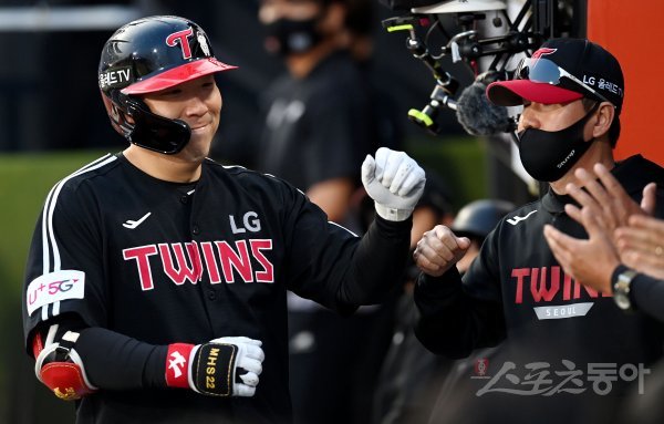17일 경기도 수원kt위즈파크에서 ‘2022 신한은행 SOL KBO리그’ kt 위즈와 LG 트윈스의 경기가 열렸다. 3회초 2사에서 LG 김현수가 솔로 홈런을 쏘아 올린 후 류지현 감독의 환영을 받고 있다.