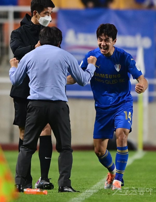 17일 경기도 수원월드컵경기장에서 열린 ‘하나원큐 K리그1 2022’ 수원 삼성과 김천 상무의 경기에서 수원 전진우가 추가골을 성공시킨 후 감독과 기쁨을 나누고 있다.
