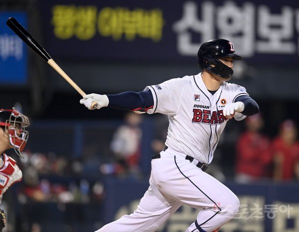 17일 서울 잠실야구장에서 ‘2022 신한은행 MY CAR KBO리그’ SSG 랜더스와 두산 베어스 경기가 열렸다. 연장 10회말 2사 1루 두산 김재환이 우전 2루타를 치고 있다.