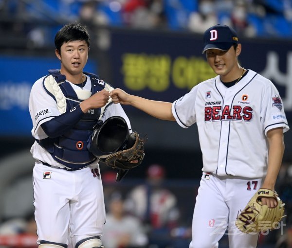 17일 서울 잠실야구장에서 ‘2022 신한은행 MY CAR KBO리그’ SSG 랜더스와 두산 베어스 경기가 열렸다. 연장 11회초 2사 두산 김민혁이 파울볼을 잡아 이닝을 종료시킨 후 홍건희와 주먹을 맞대고 있다.