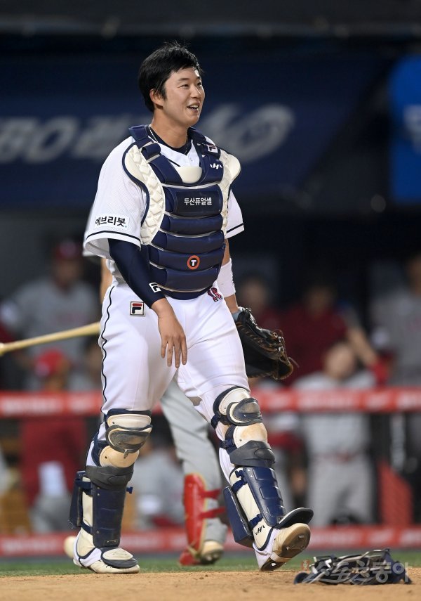 17일 서울 잠실야구장에서 ‘2022 신한은행 MY CAR KBO리그’ SSG 랜더스와 두산 베어스 경기가 열렸다. 연장 11회초 2사 두산 김민혁이 파울볼을 잡아 이닝을 종료시킨 후 웃고 있다.