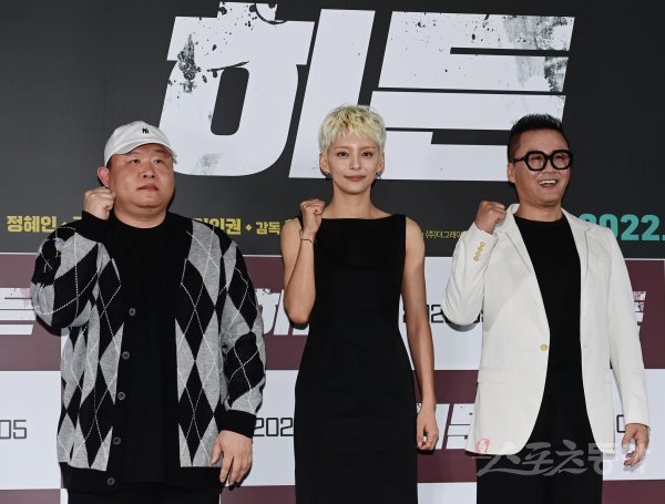 한종훈 감독, 배우 정혜인, 공형진이 18일 서울 광진구 자양동 롯데시네마 건대입구점에서 열린 영화 ‘히든’ 언론시사회에서 포즈를 취하고 있다.