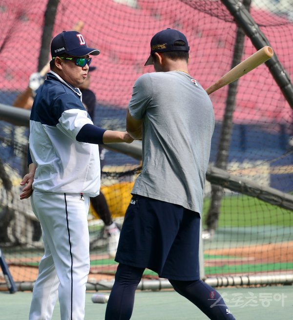 18일 서울 잠실야구장에서 ‘2022 신한은행 MY CAR KBO리그’ SSG 랜더스와 두산 베어스 경기가 열린다. 두산 김태형 감독이 송승환에게 타격 지도를 하고 있다.