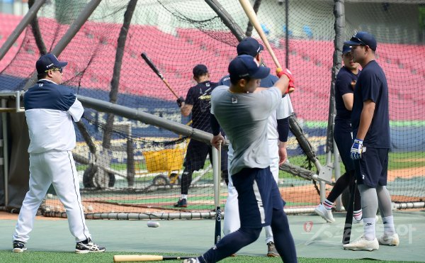18일 서울 잠실야구장에서 ‘2022 신한은행 MY CAR KBO리그’ SSG 랜더스와 두산 베어스 경기가 열린다. 두산 김태형 감독이 홍성호에게 훈련 지시를 하고 있다.
