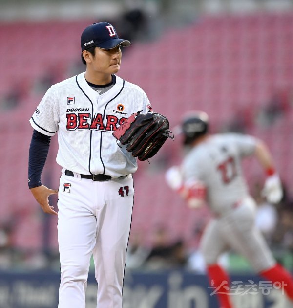 18일 서울 잠실야구장에서 ‘2022 신한은행 MY CAR KBO리그’ SSG 랜더스와 두산 베어스 경기가 열렸다. 두산 선발 곽빈이 2회초 1사 1루 SSG 크론에게 좌월 투런 홈런을 허용하고 있다.