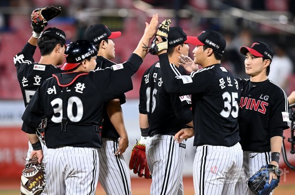 18일 경기도 수원kt위즈파크에서 ‘2022 신한은행 SOL KBO리그’ kt 위즈와 LG 트윈스의 경기가 열렸다. LG가 kt를 상대로 9-1로 승리한 뒤 선수들이 그라운드에서 기쁨을 나누고 있다.