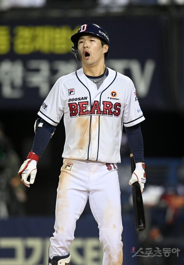18일 서울 잠실야구장에서 ‘2022 신한은행 MY CAR KBO리그’ SSG 랜더스와 두산 베어스 경기가 열렸다. 9회말 2사 2,3루 두산 조수행이 삼진 아웃을 당한 후 아쉬워하고 있다.