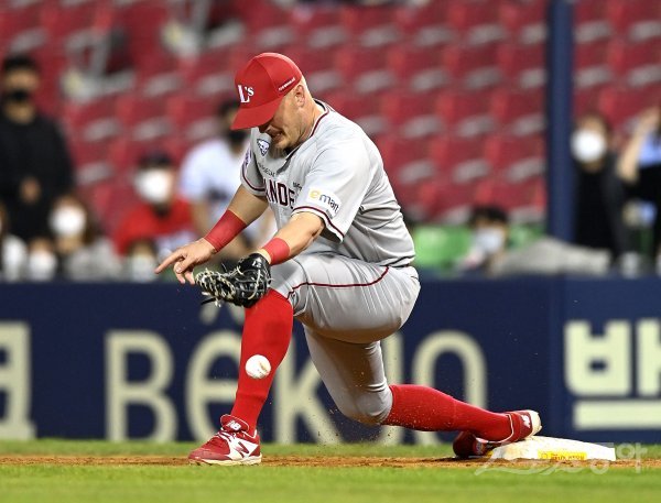 18일 서울 잠실야구장에서 ‘2022 신한은행 MY CAR KBO리그’ SSG 랜더스와 두산 베어스 경기가 열렸다. 9회말 무사 SSG 크론이 바운드 되어 송구된 볼을 놓치고 있다.