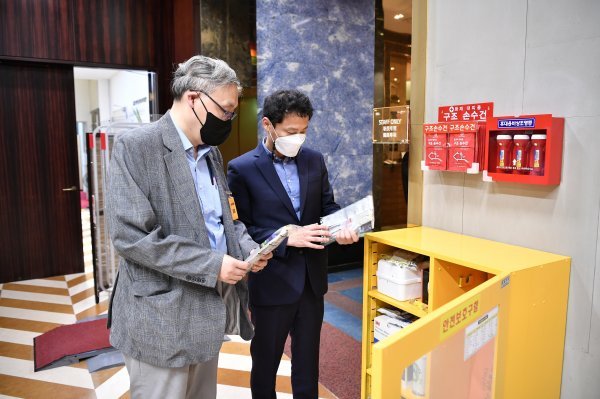 김영산 그랜드코리아 사장(오른쪽)과 왕순주 동탄성심병원 응급센터장이 세븐럭 강남코엑스점의 안전장비를 점검하고 있다. 사진제공 | 그랜드코리아레저
