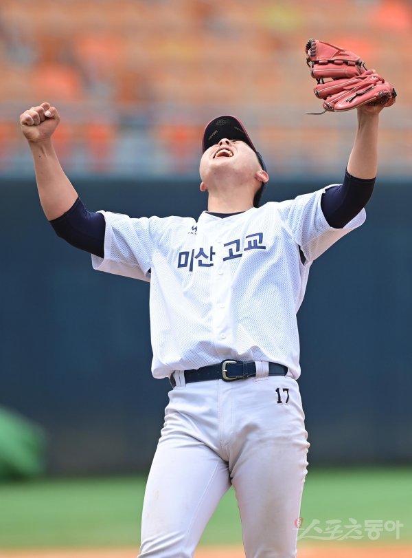 19일 서울 목동야구장에서 열린 ‘제76회 황금사자기 전국고교야구대회 겸 주말리그 왕중왕전’ 마산고와 세광고의 경기에서 세광고에 9-7로 승리를 지킨 마산고 이한서가 포효하고 있다.