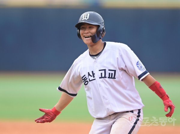 19일 서울 목동야구장에서 열린 ‘제76회 황금사자기 전국고교야구대회 겸 주말리그 왕중왕전’ 동산고와 예일메디텍고의 경기에서 7회초 2사 1, 2루 동산고 김범서가 역전 2타점 좌전 2루타를 쳐낸 뒤 세리머니를 하고 있다.