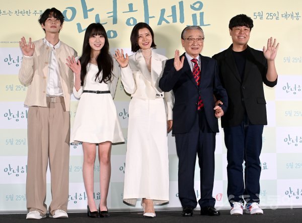19일 서울 CGV용산에서 열린 영화 ‘안녕하세요’ 시사회에서 배우 송재림, 김환희, 유선, 이순재, 차봉주 감독이 포토타임을 갖고 있다.