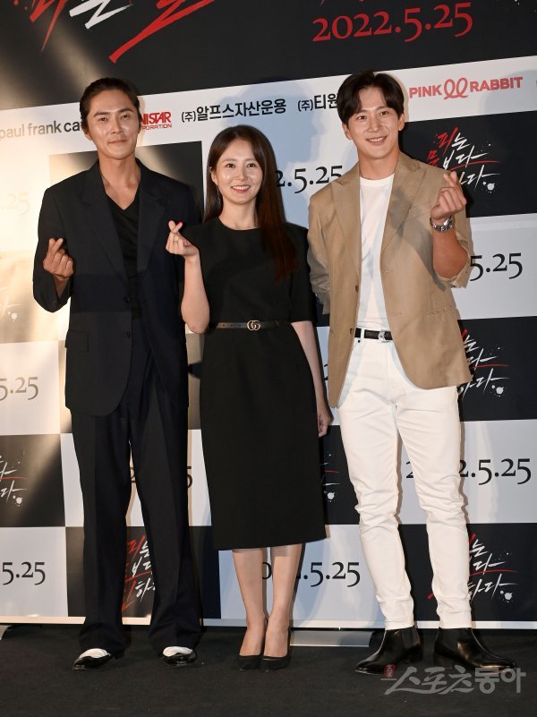 19일 서울 CGV용산에서 열린 영화 ‘피는 물보다 진하다’ 시사회에서 배우 조동혁, 임정은, 이완이 포토타임을 갖고 있다.