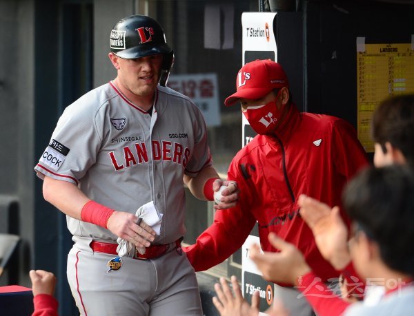 19일 서울 잠실야구장에서 열린 ‘2022 신한은행 SOL KBO리그’ 두산 베어스와 SSG 랜더스의 경기에서 2회초 1사 1, 3루 SSG의 중전 적시타 때 득점에 성공한 3루주자 크론이 하재훈의 첫 타점 기념구를 들고 축하를 받고 있다.