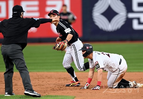 19일 경기도 수원kt위즈파크에서 ‘2022 신한은행 SOL KBO리그’ kt 위즈와 LG 트윈스의 경기가 열렸다. 2회말 2사 1, 2루에서 LG 서건창이 2루에서 kt 배정대를 포스 아웃시켰으나 심판이 세이프를 선언하고 있다. LG가 비디오판독을 요청했지만 세이프.