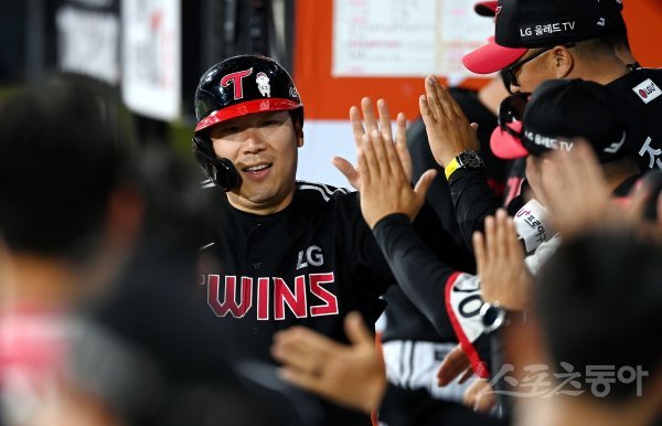 19일 경기도 수원kt위즈파크에서 ‘2022 신한은행 SOL KBO리그’ kt 위즈와 LG 트윈스의 경기가 열렸다. 6회초 2사 1, 2루에서 적시타 때 LG 김현수가 득점을 올린 후 동료들의 환영을 받고 있다.