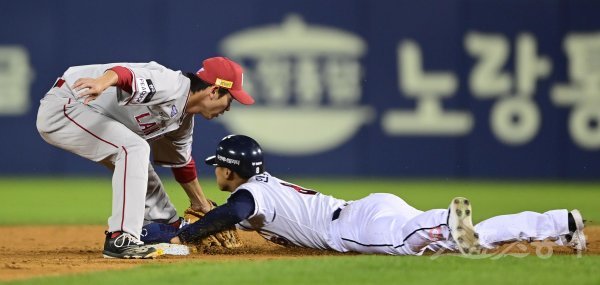 19일 서울 잠실야구장에서 열린 ‘2022 신한은행 SOL KBO리그’ 두산 베어스와 SSG 랜더스의 경기에서 5회말 2사 1루 상황에서 SSG 안현수가 도루를 시도한 1루주자를 태그 아웃시키고 있다.