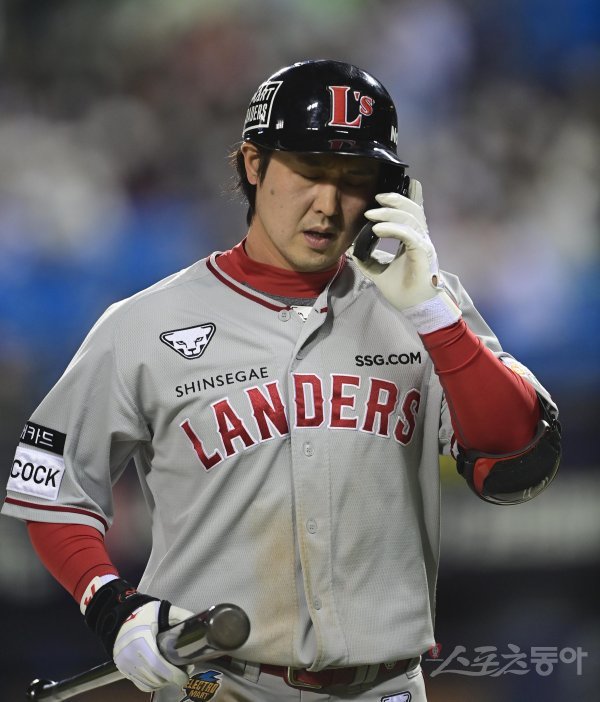 19일 서울 잠실야구장에서 열린 ‘2022 신한은행 SOL KBO리그’ 두산 베어스와 SSG 랜더스의 경기에서 9회초 무사 SSG 최정이 삼진 아웃으로 물러나며 아쉬워하고 있다.