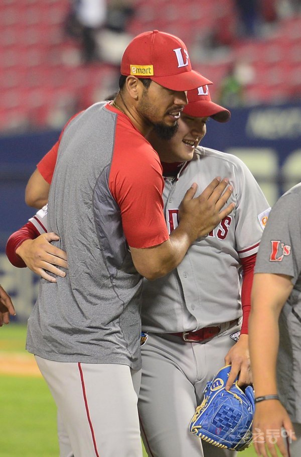 19일 서울 잠실야구장에서 열린 ‘2022 신한은행 SOL KBO리그’ 두산 베어스와 SSG 랜더스의 경기에서 두산에 9-3으로 승리한 SSG 폰트와 서진용이 기쁨을 나누고 있다.