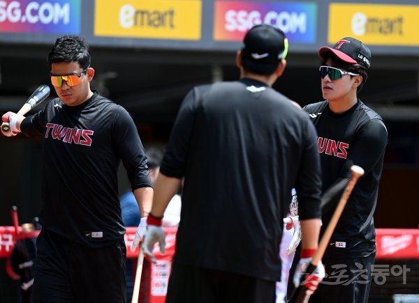 22일 인천 SSG 랜더스필드에서 ‘2022 신한은행 SOL KBO리그’ SSG 랜더스와 LG 트윈스의 경기가 열린다. 경기 전 LG 선수들이 훈련에 앞서 이야기를 나누고 있다.