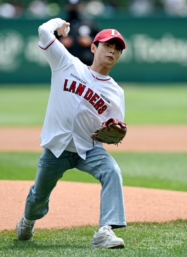 22일 인천 SSG 랜더스필드에서 ‘2022 신한은행 SOL KBO리그’ SSG 랜더스와 LG 트윈스의 경기가 열렸다. 경기 전 보이그룹 ‘LUCY’ 신예찬이 시구를 던지고 있다.