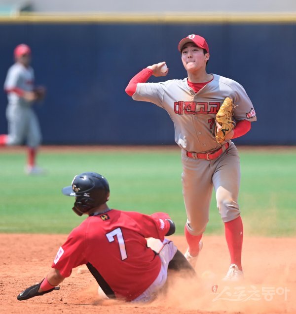 22일 서울 목동야구장에서 ‘제76회 황금사자기 전국고교야구대회 겸 주말리그 왕중왕전’ 경동고와 대전고의 32강전 경기가 열렸다. 6회말 무사 1루 경동고 3번 타자 임서준의 내야 땅볼 때 대전고 유격수 홍서연이 1루주자 최진원을 포스 아웃시킨 뒤 1루로 송구하고 있다.
