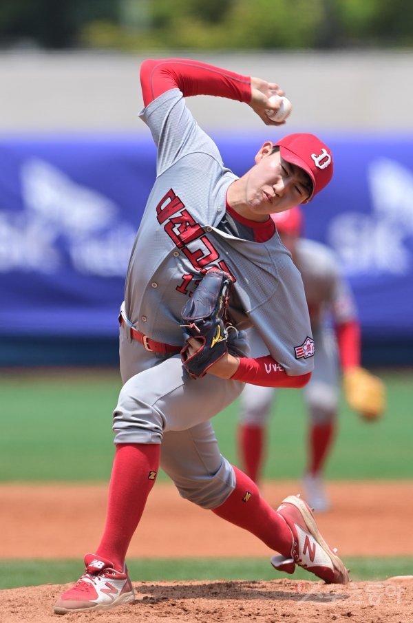 22일 서울 목동야구장에서 열린 ‘제76회 황금사자기 전국고교야구대회 겸 주말리그 왕중왕전’ 경동고와 대전고의 32강전 경기에서 선발 투수로 마운드에 오른 대전고 이종왕이 역투하고 있다.