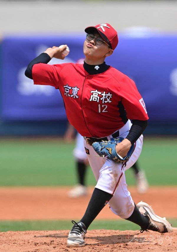 22일 서울 목동야구장에서 열린 ‘제76회 황금사자기 전국고교야구대회 겸 주말리그 왕중왕전’ 경동고와 대전고의 32강전 경기에서 선발 투수로 마운드에 오른 경동고 윤한선이 역투하고 있다.