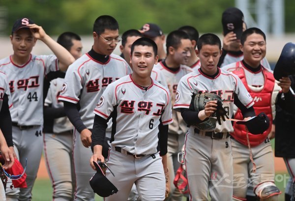 22일 서울 목동야구장에서 열린 ‘제76회 황금사자기 전국고교야구대회 겸 주말리그 왕중왕전’ 설악고와 신흥고의 32강전 경기에서 신흥고에 6-3으로 승리한 설악고 선수들이 기뻐하고 있다.