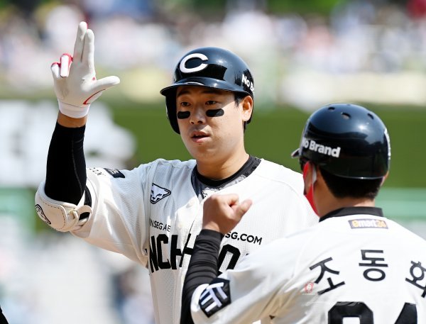 22일 인천 SSG 랜더스필드에서 ‘2022 신한은행 SOL KBO리그’ SSG 랜더스와 LG 트윈스의 경기가 열렸다. 3회말 2사에서 SSG 오준혁이 안타를 날린 후 세리머니를 펼치고 있다.