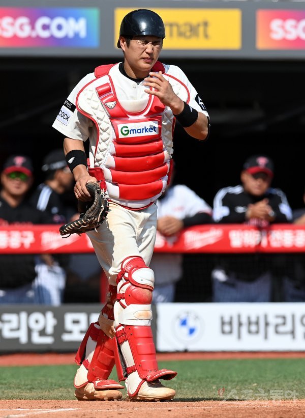 22일 인천 SSG 랜더스필드에서 ‘2022 신한은행 SOL KBO리그’ SSG 랜더스와 LG 트윈스의 경기가 열렸다. 6회초 1사 1루에서 SSG 김민식이 파울 타구에 맞은 후 고통을 호소하고 있다.