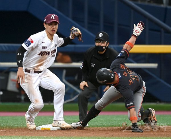 22일 서울 고척스카이돔에서 ‘2022 신한은행 MY CAR KBO리그’ 한화 이글스와 키움 히어로즈 경기가 열렸다. 6회초 1사 1,2루 한화 안타 때 볼이 홈으로 송구되는 사이 1루주자 노수광이 3루까지 달려 세이프 되고 있다.