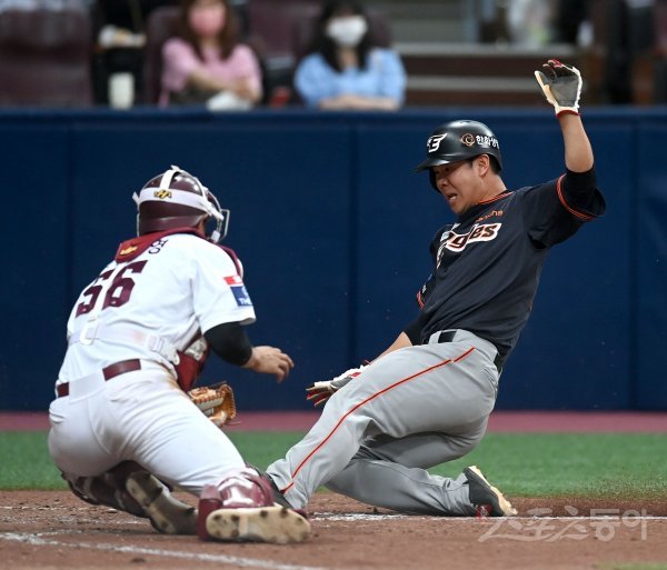 22일 서울 고척스카이돔에서 ‘2022 신한은행 MY CAR KBO리그’ 한화 이글스와 키움 히어로즈 경기가 열렸다. 6회초 1사 1,2루 한화 이도윤 안타 때 2루주자 김인환이 홈까지 달렸으나 아웃되고 있다.
