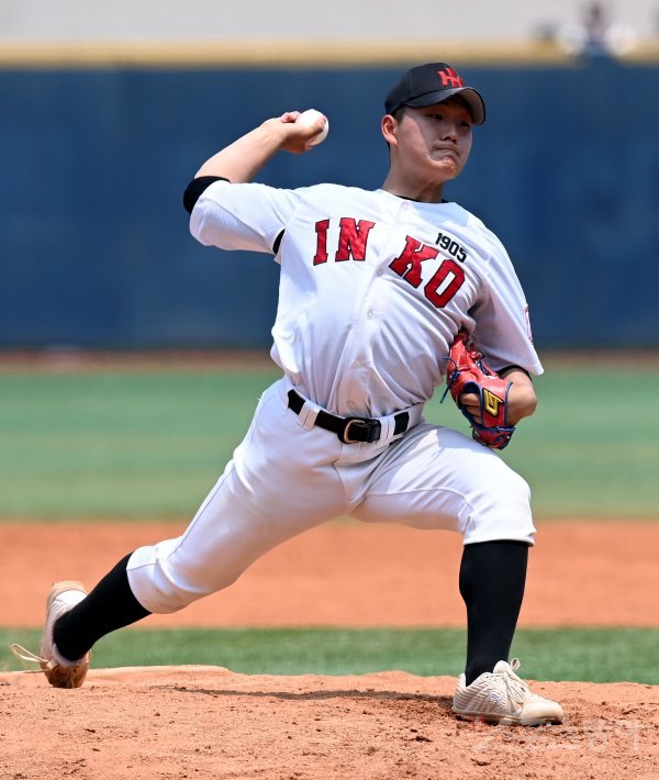 23일 서울 목동야구장에서 열린 ‘제76회 황금사자기 전국고교야구대회 겸 주말리그 왕중왕전’ 인천고와 개성고의 32강 경기에서 인천고 선발투수 김택연이 힘차게 볼을 던지고 있다.