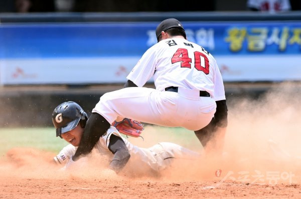 23일 서울 목동야구장에서 열린 ‘제76회 황금사자기 전국고교야구대회 겸 주말리그 왕중왕전’ 인천고와 개성고의 32강 경기에서 5회초 2사 1,3루에서 폭투 째 개성고 김도현이 홈으로 파고들다 인천고 김택연에게 택 아웃되고 있다.