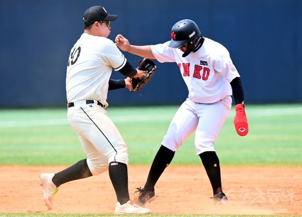 23일 서울 목동야구장에서 열린 ‘제76회 황금사자기 전국고교야구대회 겸 주말리그 왕중왕전’ 인천고와 개성고의 32강 경기에서 4회말 무사 1, 2루에서 인천고 2루 주자 정상훈이 태그 아웃되고 있다.
