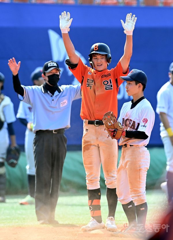 23일 서울 목동야구장에서 열린 ‘제76회 황금사자기 전국고교야구대회 겸 주말리그 왕중왕전’ 북일고와 배재고의 32강 경기에서 4회초 1사 1, 2루에서 북일고 이진용이 2타점 3루타를 날린 후 환호하고 있다.