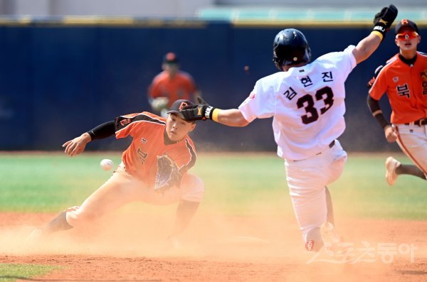 23일 서울 목동야구장에서 열린 ‘제76회 황금사자기 전국고교야구대회 겸 주말리그 왕중왕전’ 북일고와 배재고의 32강 경기에서 2회말 2사 1루에서 북일고 문형빈이 2루 도루를 시도하던 배재고 김현진을 아웃시키고 있다.