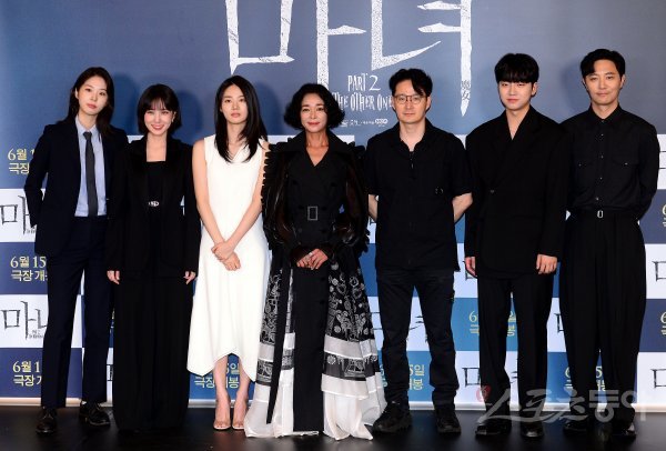 24일 서울 JW 메리어트 동대문 스퀘어 그랜드 볼룸에서 진행된 영화 ‘마녀2’ 제작보고회에 참석한 배우 서은수, 박은빈, 신시아, 조민수, 박훈정 감독, 성유빈, 진구가 포즈를 취하고 있다.영화 ‘마녀2’는 초토화된 비밀연구소에서 홀로 살아남아 세상 밖으로 나오게 된 소녀 앞에 각기 다른 목적으로 그를 쫓는 세력들이 모여들면서 벌어지는 일을 그린 액션 영화로 6월 15일 개봉한다.