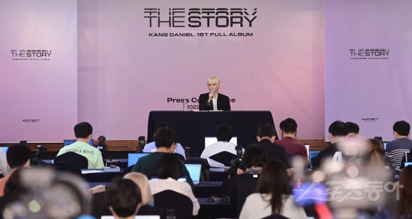 가수 강다니엘이 24일 서울 강남구 삼성동 그랜드인터컨티넨탈 서울파르나스에서 열린 첫 번째 정규앨범 ‘THE STORY’ 발매 기념 기자간담회에서 질문에 답하고 있다.