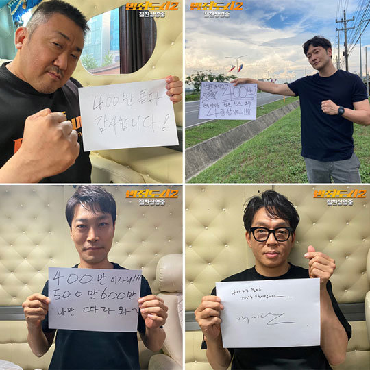 ‘괴물형사’ 마석도 역으로 변신한 마동석은 압도적인 비주얼과 함께 “400만 돌파 감사합니다!” 인사를 전했고 ‘최강 빌런’ 강해상 역으로 폭발적인 반응을 모으고 있는 손석구 역시 “<범죄도시2> 400만! 관객 여러분 한 분 한 분 모두 4랑합니다” 라며 센스 있는 감사인사를 전했다. 이어 ‘전일만’ 역의 최귀화와 ‘장이수’ 역의 박지환 역시 “400만이라니! 500만, 600만 나만 따라와~”, “400만 돌파 정말 감사합니다”라며 극장을 찾아준 관객들에게 진심 어린 고마움을 표했다. 이어 금천서 강력반으로 돌아온 ‘오동균’ 역의 허동원과 ‘강홍석’ 역의 하준 그리고 ‘김상훈’ 역의 정재광까지 “400만 돌파! 뜨거운 사랑 진심으로 감사합니다!”, 영화의 신스틸러를 담당한 ‘장순철’ 역의 김찬형과 ‘최용기’ 역의 차우진 역시 “400만 돌파 감사합니다!”라며 관객들의 뜨거운 성원에 화답했다.