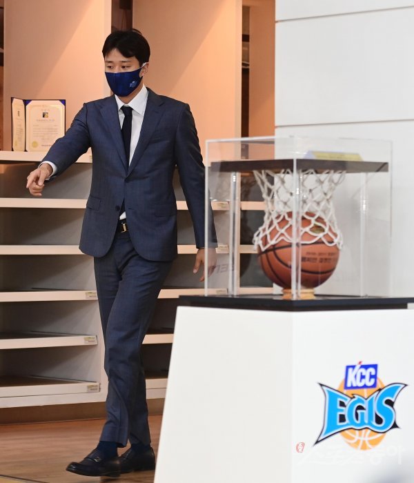 24일 서울 강남구 서초동 KCC빌딩에서 열린 ‘KCC 이지스 입단식’ 기자간담회에 허웅이 입장하고 있다.