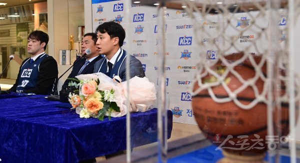 24일 서울 강남구 서초동 KCC빌딩에서 열린 ‘KCC 이지스 입단식’ 기자간담회에서 허웅이 질문에 답하고 있다.