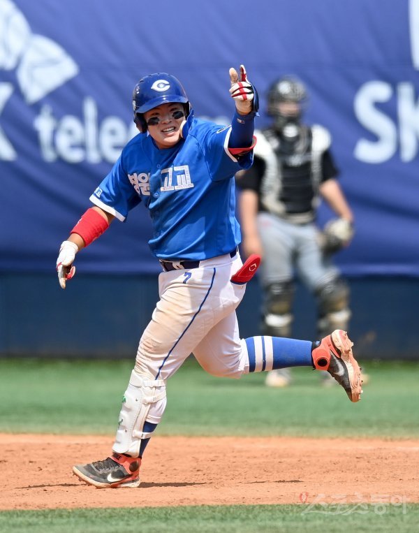 24일 서울 목동야구장에서 열린 ‘제76회 황금사자기 전국고교야구대회 겸 주말리그 왕중왕전’ 율곡고와 청원고의 16강전 경기 8회말 무사 1루 청원고 김현영이 콜드승을 완성시키는 좌월 투런 홈런을 날린 후 환호하고 있다.