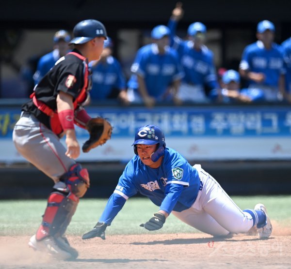 24일 서울 목동야구장에서 열린 ‘제76회 황금사자기 전국고교야구대회 겸 주말리그 왕중왕전’ 율곡고와 청원고의 16강전 경기 4회말 1사 2루 청원고 안타 때 2루주자 서준혁이 홈으로 달려 역전 득점에 성공하고 있다.